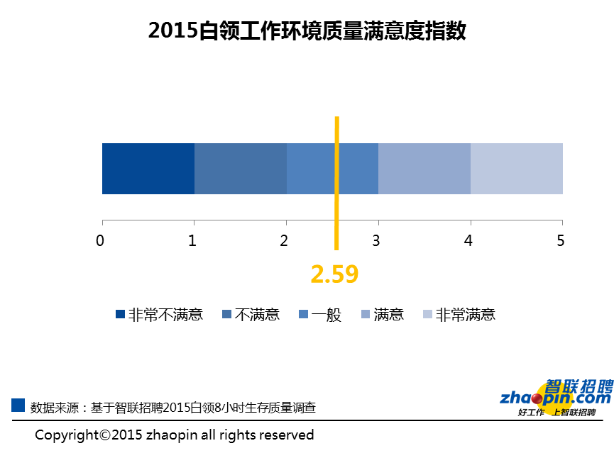 《报告》的结果一发布,不少老板都大跌眼镜。因为调查显示,如果将白领对工作环境的满意度分为非常不满意、不满意、一般、满意、非常满意五档,那么2015白领工作环境满意度指数仅为2.59。从5分制满分的角度来看,这也说明在为员工营造良好的工作环境方面,大多数企业的表现其实都不及格。其中相对于职场前辈而言,80和90后对工作环境的满意度明显偏低。