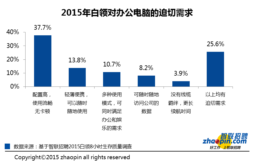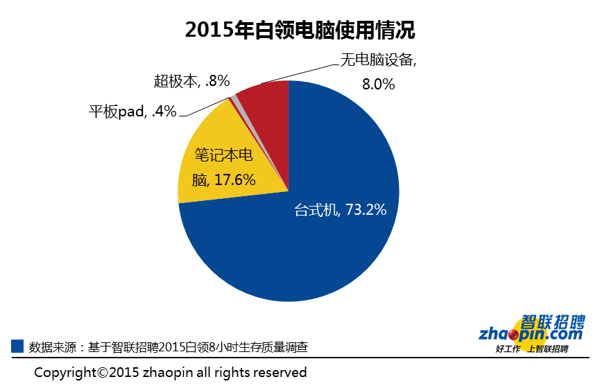 本次调查发现,73.2%的白领在工作中使用台式机,配备笔记本电脑的比例仅为17.6%,还有8%的白领没有配备电脑设备。此外超级本、平板Pad的配备比例非常低,分别只有0.8%和0.4%。此外《报告》还显示,在“互联网+”时代,开机时间长、审批流程繁琐、使用不流畅时常卡顿等因素最影响白领工作效率。此外不少员工对于“电脑老旧性能慢”和“办公设备更新周期太长”也颇有怨言。