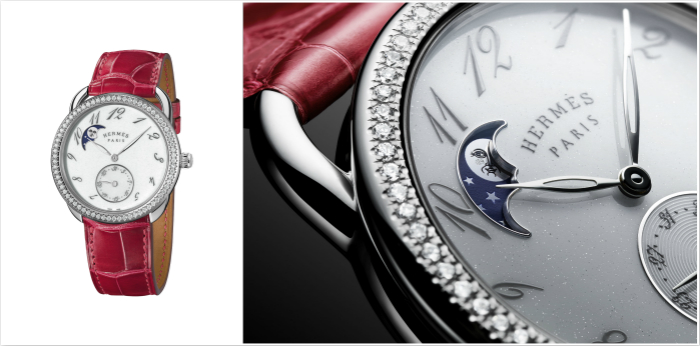 爱马仕Arceau Petite Lune小月相腕表线条设计简约利落,点缀着创意与休闲元素。闪亮的乳白色表盘上缀有“旋转”的珍珠灰阿拉伯时标,与镂空指针相得益彰。象征着月球亮面的圆盘映衬于闪闪发光的月球背景之下,显得格外引人瞩目。 这个略带几分顽皮的天体图案由德籍法裔艺术家爱德华·巴里布德 (Édouard Baribeaud) 专为爱马仕方巾设计,灵感来 自莎士比亚喜剧《仲夏夜之梦》。