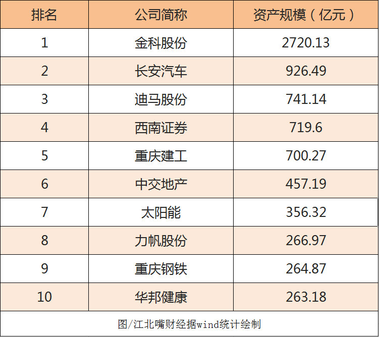 江北嘴财经统计,金科股份、长安汽车、迪马股份、西南证券、重庆建工、中交地产、太阳能、力帆股份、重庆钢铁、华邦健康进入资产规模排名前十,分别为2720.13亿元、926.49亿元、741.14亿元、719.60亿元、700.27亿元、457.19亿元、356.32亿元、266.97亿元、264.87亿元、263.18亿元。排名前十的企业上半年的总资产规模7814.61亿元,占据50家上市企业总资产规模的77.28%。