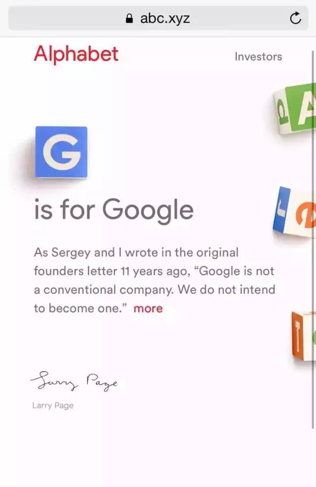 佩奇说,Alphabet(字母表)是语言文字字母的集合,而语言是人类最为重要的创新,也是谷歌搜索的索引核心。同时,Alpha也有投资回报的意思,佩奇表示会尽力给(投资者)带来回报。