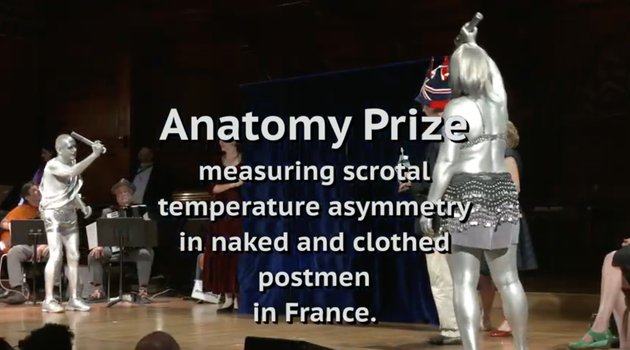 科学界此前曾争论过,男性的左侧阴囊温度是否比右侧稍高一些。很多人都知道,有时左侧阴囊的位置会略低于右侧,这可能是为了避免两个阴囊相互碰撞、也可能是为了更好地散热降温,而这两点原因之间或许也有一定关联。有一些研究显示,两侧阴囊的温度存在不对称性,而有些研究则否定了这一点。因此此次获奖者们决定自己开展研究一探究竟。他们分别测量了年轻的邮递员在未穿衣服和穿衣服状态下的阴囊温度,结果发现两侧温度的确不一致。研究人员总结道:“左右两侧阴囊的温度差别也许在一定程度上导致了男性外生殖器的不对称性。”