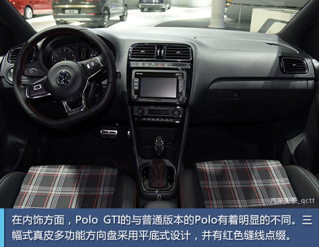 在内饰方面,Polo GTI的与普通版本的Polo有着明显的不同。三幅式真皮多功能方向盘采用平底式设计,并有红色缝线点缀,看起来相当精致动感。运动金属刹车油门踏板也是运动车型的象征。GTI样式的格子布料也被用在了其运动座椅上,传承了GTI精神。