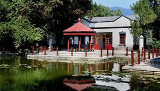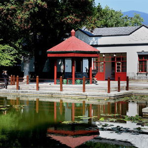 从香山公园东门入园,拾级而上,便可来到双清别墅。六角红亭旁,池水清澈,绿草茵茵。屋内入口处,悬挂着一张毛泽东同志在香山读报的黑白照片,报纸上“南京解放”四个大字赫然可见。屋内摆放着毛泽东曾使用过的办公桌、沙发、床等家具及物品。