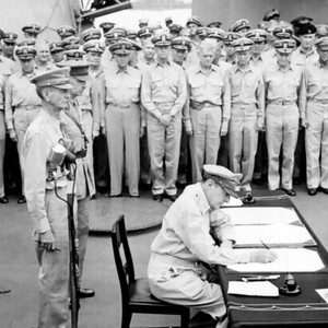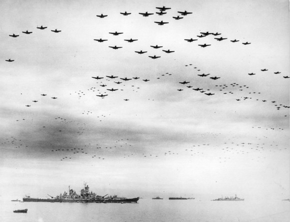 6. 1945年9月2日,标志二战结束的投降仪式正在美国海军密苏里号战列舰上进行,上百架F4U海盗式战斗机和F6F地狱猫战斗机编队飞过战列舰上空。