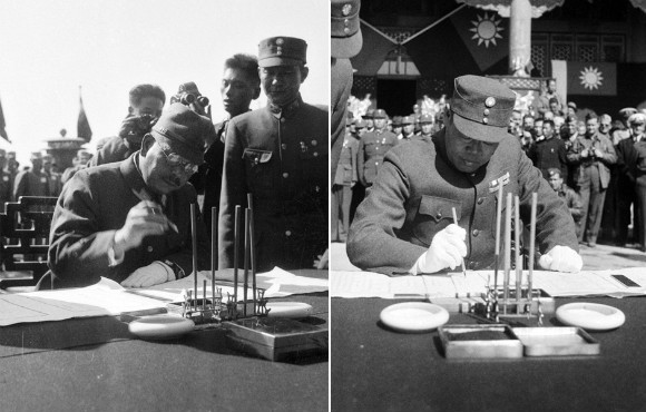 12. 图为日军华北方面司令官根本博中将(左)、中国受降主官孙连仲上将(右),分别签字。