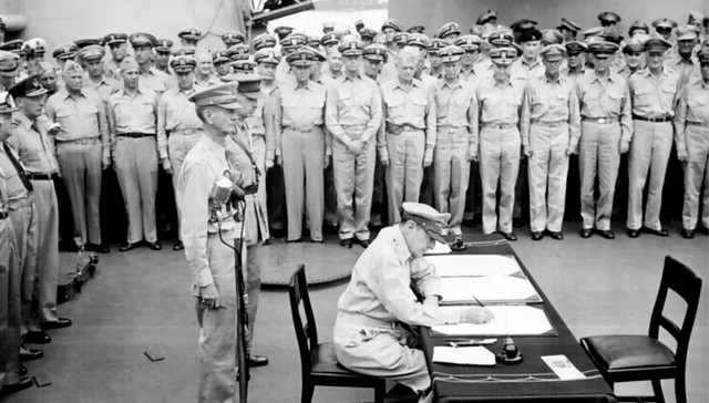 7. 1945年9月2日上午9时,东京湾,密苏里号战列舰上的日本投降文件签署仪式。这张照片里,梅津美治郎将军代表日本武装力量签署投降书,(他身后戴着大礼帽的)日本外相重光葵之前已经代表日本政府签字。
