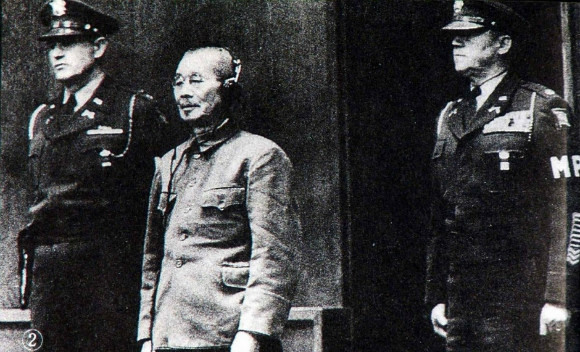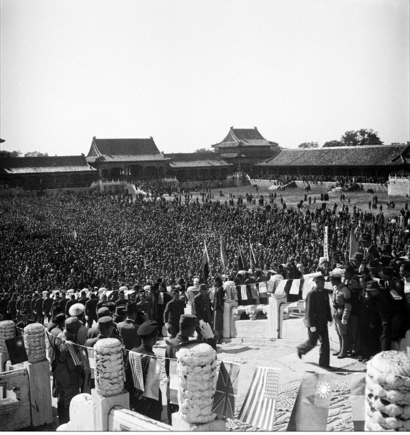 11. 1945年10月10日,北平。中国战区华北日本投降仪式在故宫太和殿举行。日军华北方面司令官根本博中将、中国受降主官孙连仲上将,分别签字。当日军献刀时,群众山呼“中国万岁!”签字仪式结束后,使用之桌椅文具均移送历史博物馆收藏。