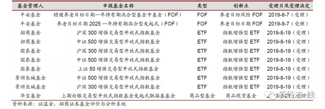 此外,新经济e线统计发现,除了首度获批的3只商品期货ETF以外,今年8月证监会首次受理了指数增强型ETF产品的募集申请,招商、国泰、景顺长城3家基金公司7只指数增强型ETF基金获得受理。除此之外,8月还上报了1只养老目标风险型FOF、1只养老目标日期型FOF和1只商品型基金产品。