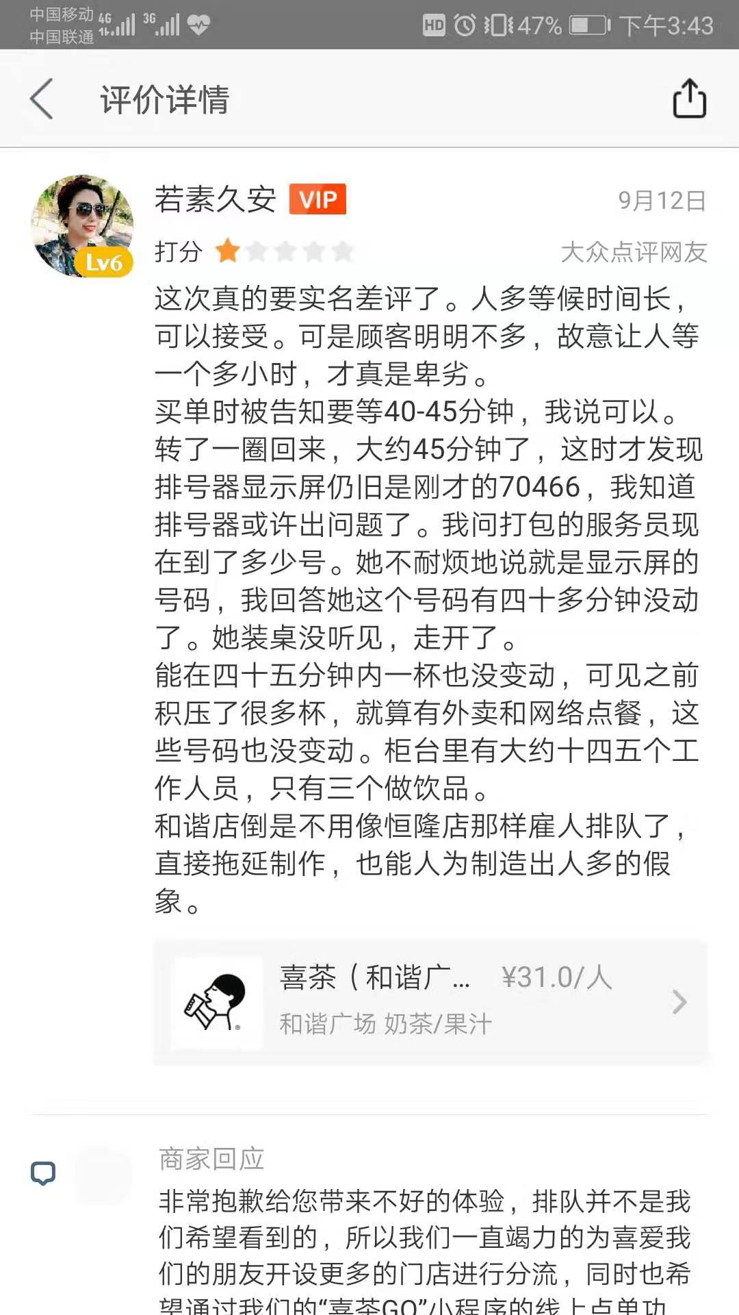 公开资料显示,喜茶创立于2012年,目前在全国已有160多家门店,覆盖全国26个城市。今年1月26日,涉事的喜茶济南和谐广场店正式营业,目前该市共有两家店面运营。界面新闻注意到,涉事喜茶门店因等餐时间久等问题,曾遭到外卖客户端顾客的差评。