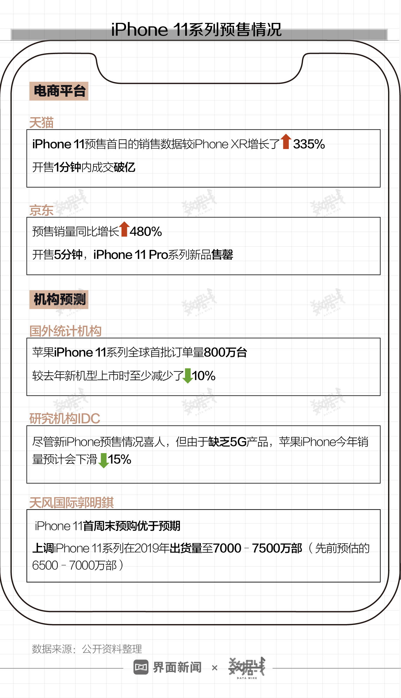预售开启首日,iPhone 11在中国主流电商平台上遭抢购。在天猫上,iPhone 11预售首日销售数据较iPhone XR增长了335%。在京东上,预售销量同比增长480%。