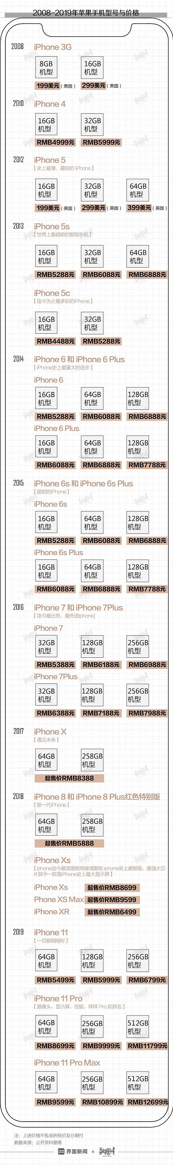 界面数据(公众号ID:shujuxian_kuaikan)进一步统计中国官网历年iPhone价格后发现,iPhone 11 64GB机型预售价5499元,比去年发布的iPhone XR低了1000元,但iPhone 11 Pro Max 512GB机型预售价已达到12699元。