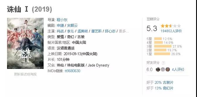 《诛仙Ⅰ》豆瓣评分已经由开画6.7下跌至5.3,超过19万人评分。