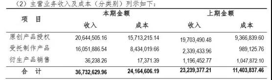 衍生品方面,博润通2019年上半年动漫衍生品收入占营收总比10.99%,相比去年同期的19.96%下降,但衍生品成本占比也大大降低,主要原因是公司品牌效应凸显、且加大公司内控和预算的管理,控制成本费用的合理化支出所带来的改变。