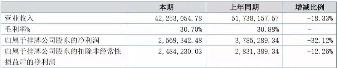 2019年上半年,公司实现营业收入 2529.99 万元,净利润 39.25 万元,与去年同期收入 2768.00万元和净利润 6.62 万元相比,营业收入减少 8.60%,净利润实现较大幅度增长。
