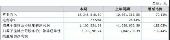 2019 年上半年公司实现了营收1.58亿元,较上期增幅为 67.66%;扣非净利润263万元,同比增长165.63%。