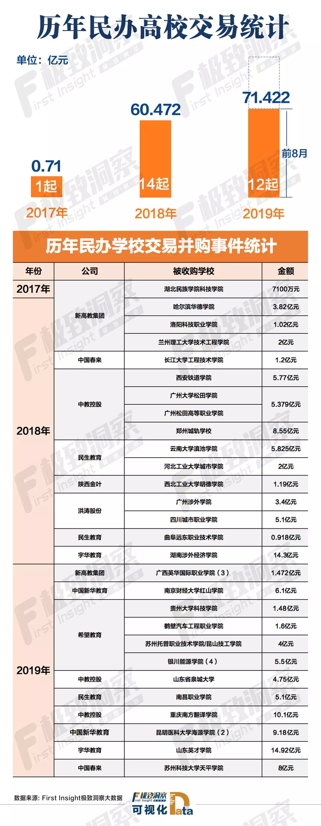 2019年7-8月,民办大学并购金额超43亿元,7月,宇华教育14.92亿收购山东英才;春来教育8亿元收购苏州科技大学天平学院;中国新华教育9.18亿元收购昆明医科大学海源学院;希望教育1.6亿元收购鹤壁汽车工程职业学院。8月,希望教育以4亿元收购苏州托普职业技术学院及昆山技工学院;月底又以5.5亿元收购银川的4个学校和2个公司......