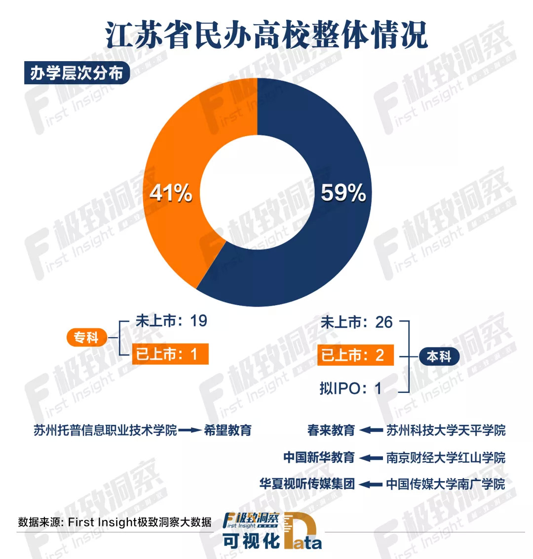 据FirstInsight极致洞察(ID:ieduclub)统计,江苏省拥有民办高校49所,其中专科院校20所,希望教育收购苏州托普信息职业技术学院为江苏省专科院校中唯一一所上市院校。