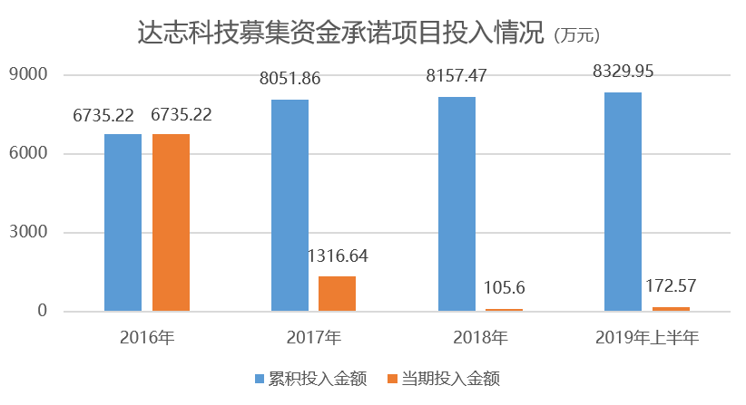 在上市第一年的不到半年时间里,达志科技募投金额近7000万元,募投进度便已完成了38%;第二年进度大幅放缓,当年投入1300余万元,募投进度至45.7%;第三年更是几无进展,仅投入了百余万元,进度46%;2019年上半年,实控人满心思想着马上解禁套现,项目进展依然很慢,只投入了172.57万元,进度刚过47%。