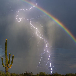 来自美国亚利桑那州的摄影爱好者Greg McCown最近终于拍下了这样的照片——在亚利桑那Marana小镇的上方,一道闪电和一条彩虹同时出现在了天空中。你们感受下: