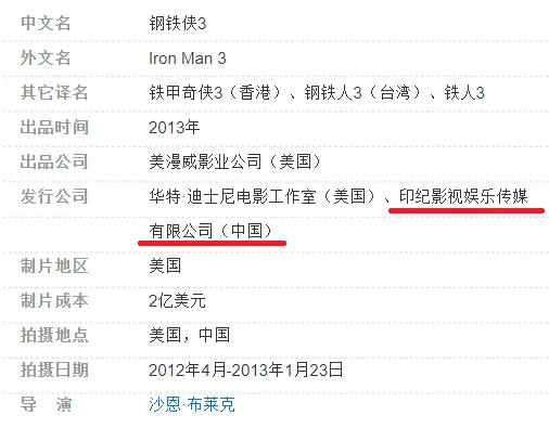 2013年,印纪传媒与漫威合作拍摄的《钢铁侠3》在国内正式上映,随即收获了7.54亿元的国内票房,位列当年国内票房榜亚军。据悉,不同于以往简单的投资,此次印纪传媒直接参与了《钢铁侠3》的策划、剧本、投资、拍摄等多个环节。