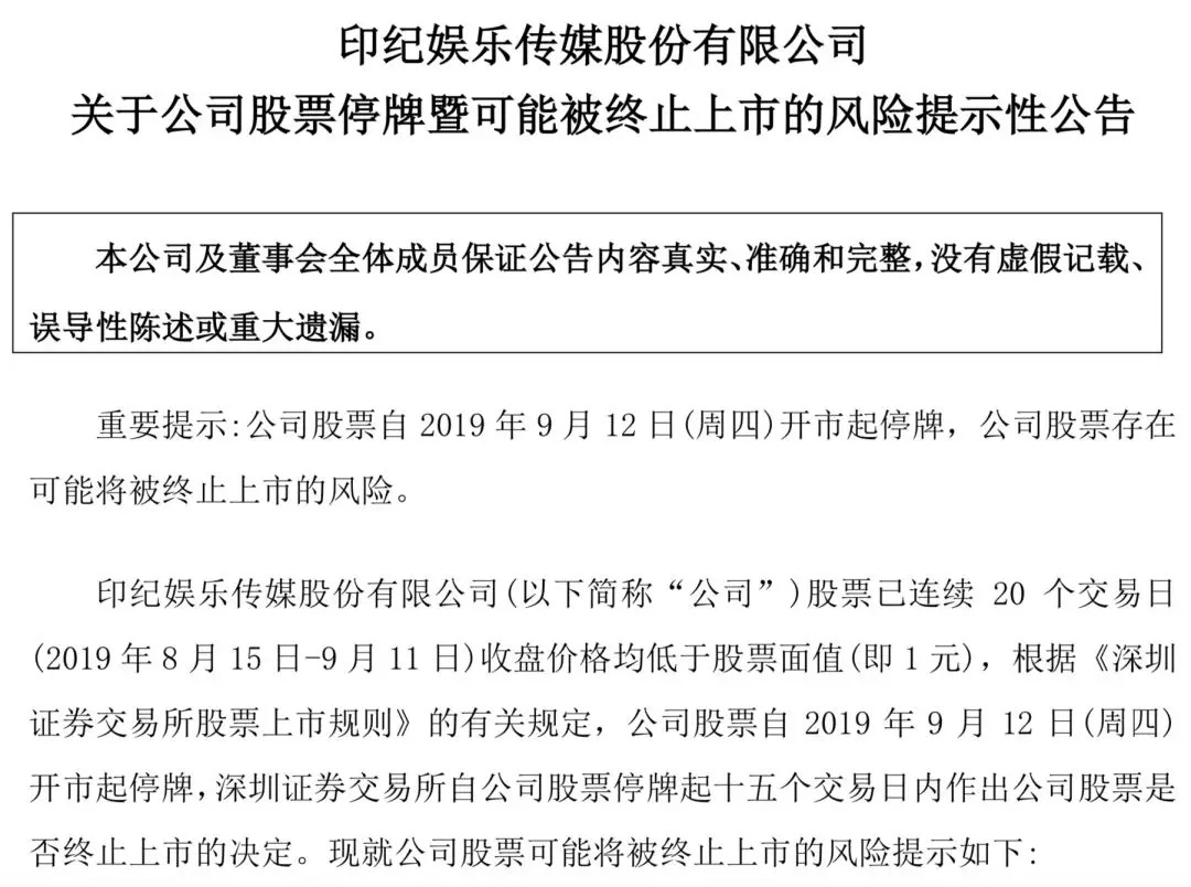 9月12日,因股票价格连续20个交易日收盘价格低于1元,印纪传媒正式停牌,等待他们的将是深交所有关能否继续上市的 “生死判决”。