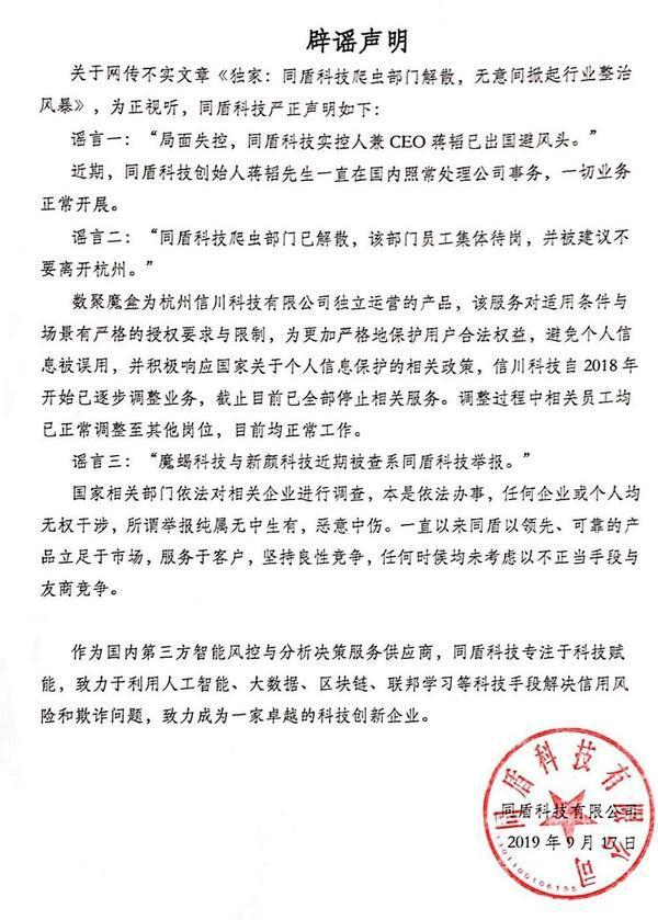 针对近期谣言,同盾科技对此曾发布了《辟谣声明》