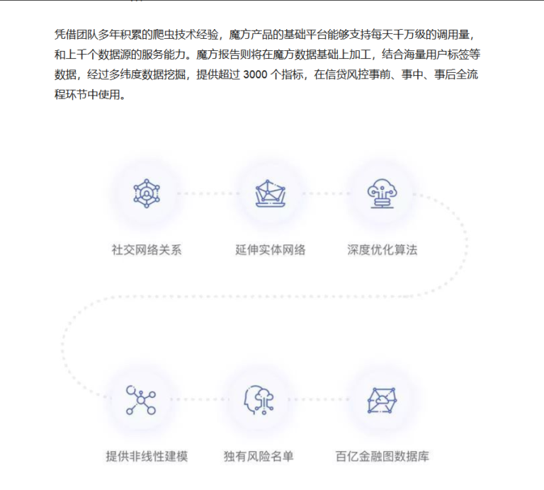 凭借团队多年积累的爬虫技术经验,魔方产品的基础平台能够支持每天千万级的调用量,和上千个数据源的服务能力。魔方报告则将在魔方数据基础上加工,结合海量用户标签等数据,经过多纬度数据挖掘,提供超过3000 个指标,在信贷风控事前、事中、事后全流程环节中使用。
