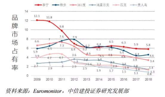 在2012-2016年这段时间里,整体运动鞋服行业都处于调整期,直到2017年才开始有所好转。在此期间,贵人鸟错过了蓄力的黄金期,品牌市场占有率持续下滑,也是被李宁、特步赶超的主要原因。