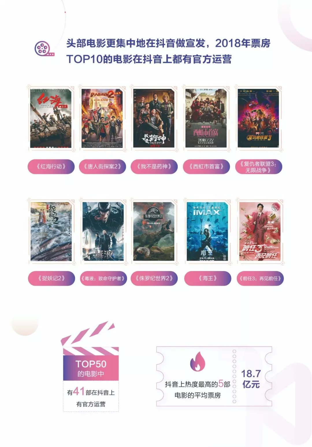 去年,短视频营销成为了电影互联网宣发的重要组成部分。据统计,2018年票房TOP20的电影里,有14部影片在抖音上有官方运营账号。其中,不少影片的短视频营销成为了“破圈”的典型案例。