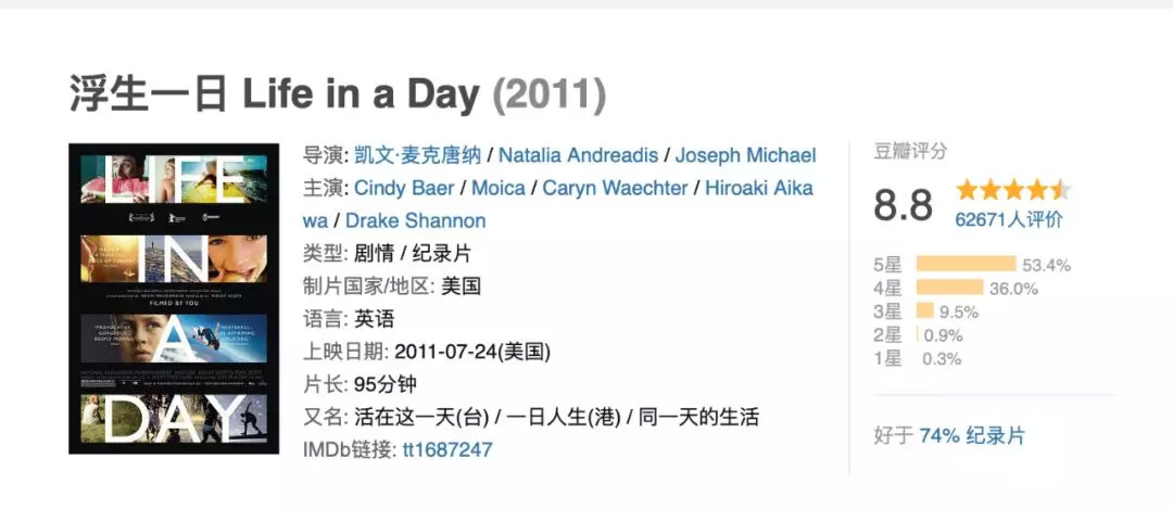 之所以做出这个判断,来源于前两年YouTube制作了一部UGC纪录片《浮生一日》。这部纪录片至今在豆瓣电影上的评分为8.8分,由于快手本身有着足够大的UGC“能量”,那么制作一部“全景中国”想必也不是一件难事。