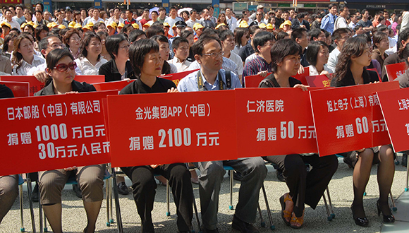 5. 2008年5月19日14点28分,上海南京路步行街内,市民与海内外游人向汶川地震遇难者默哀。众多企事业单位和群众在默哀悼念现场进行捐款援助灾区人民。