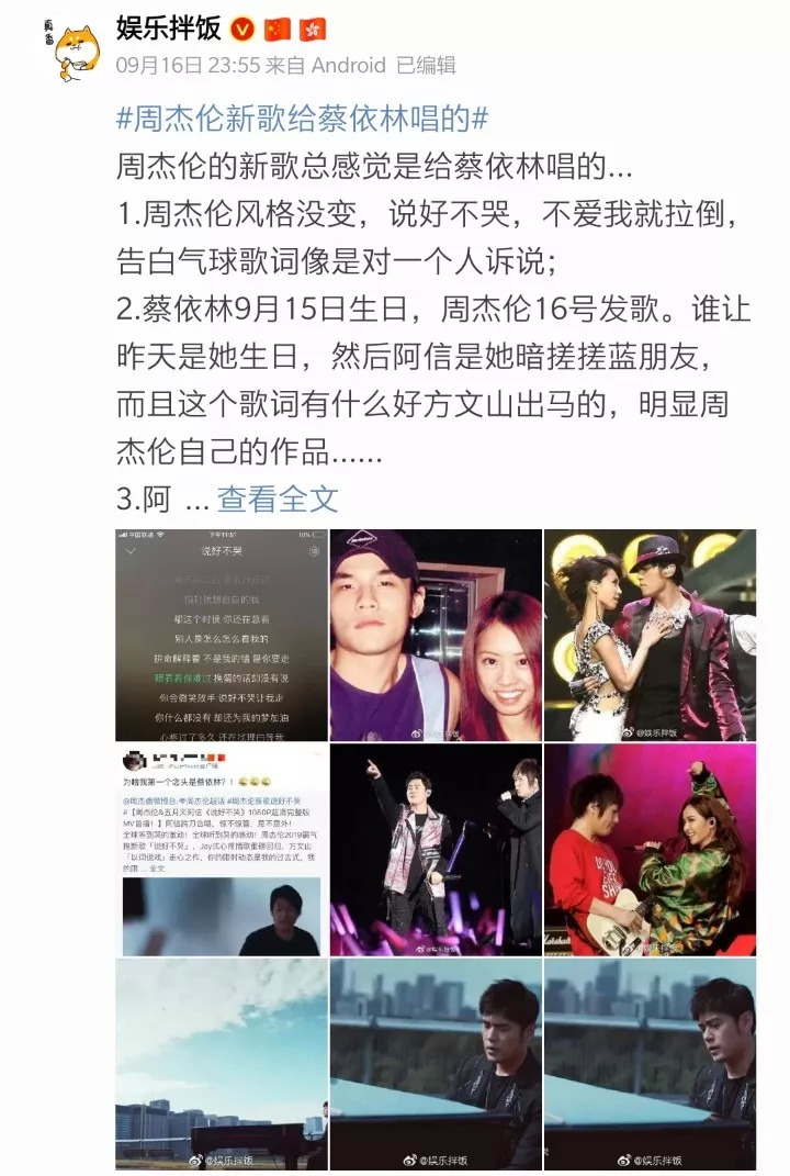 有说周的新歌是写给蔡的,从词曲风格到发行日期逐条分析,还搬出他们的共同好友阿信,来给这段疑似隔空喊话加一条佐证。