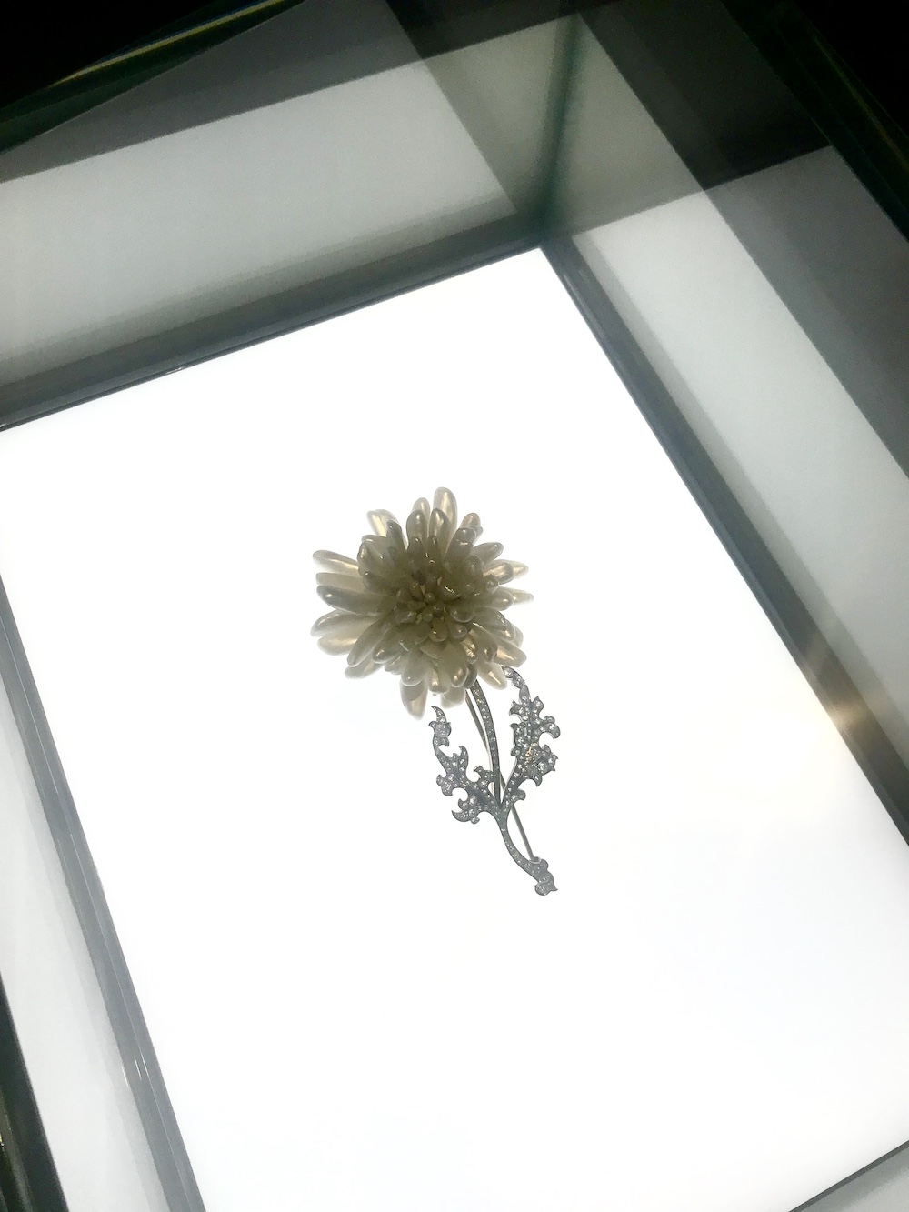 为了尽可能还原一支菊花的形状,当时的蒂芙尼珠宝师从美国密西西比河中找到了数枚形似菊花花瓣的淡水犬齿珍珠,制成了一朵珍珠菊花,再用铂金和钻石打造了树枝和叶子的形状。