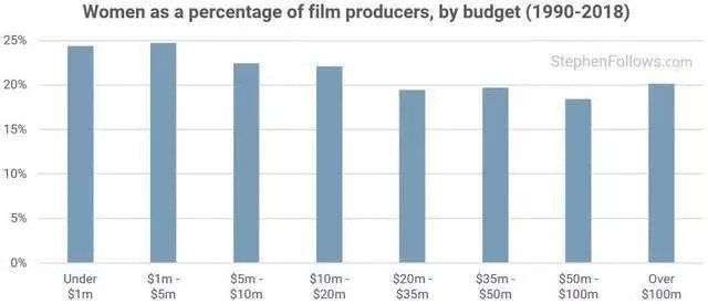 认为女性可能干不好制片工作,不仅仅是来自于人们的偏见。实际上,Stephen Follows的调查显示,即便在全球,在所有制片岗位中,职位越高,女性比例越低;而女性制片人的职业生涯也经常容易被限定在了小成本制作中:预算在500万美元以下的电影中,女性制片占23%,但预算在5000万美元以上的电影中,女性制片只占16%。随着项目资金、规模扩大,女性担任现场制片的比例也大幅下降。