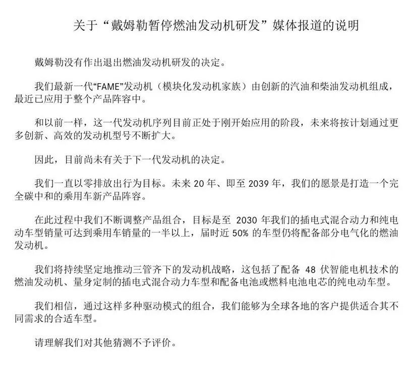 戴姆勒今天做出官方声明,明确表示没有作出退出燃油发动机研发的决定。