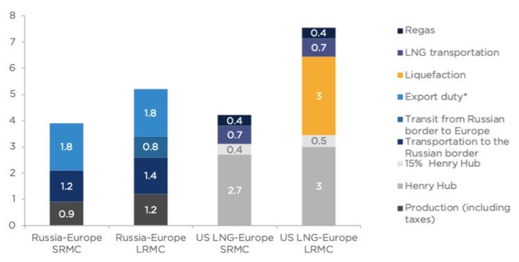 凭借遍布欧洲大陆的现有天然气管道网,俄罗斯天然气在开采成本、长期边际成本和短期边际成本等各方面都具有显著优势。即便算上俄罗斯高达30%的天然气出口税,美国LNG的价格仍难以匹敌。
