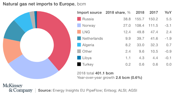 借助着价格优势和天然气价格下跌的“大好时机”,2018年俄罗斯在欧洲天然气市场斩获了有史以来的最大市场份额,从上年的35%上升到了38.8%,全年出口量高达1557亿方。