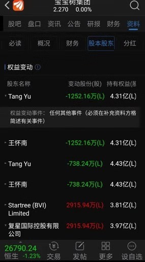宝宝树内部人士向界面新闻记者透露,尽管还未对外披露,但实际上王怀南已经淡出管理团队。根据天眼查数据显示,王怀南是宝宝树的第一大股东,持有宝宝树近79.66%的股份。最新的一项权益变动显示,王怀南及其妻子Tang Yu已经抛售了约2000万股,总价值约8.74亿港元的股份。