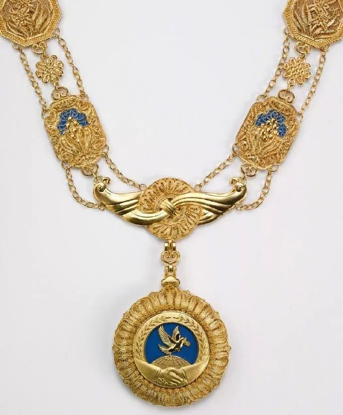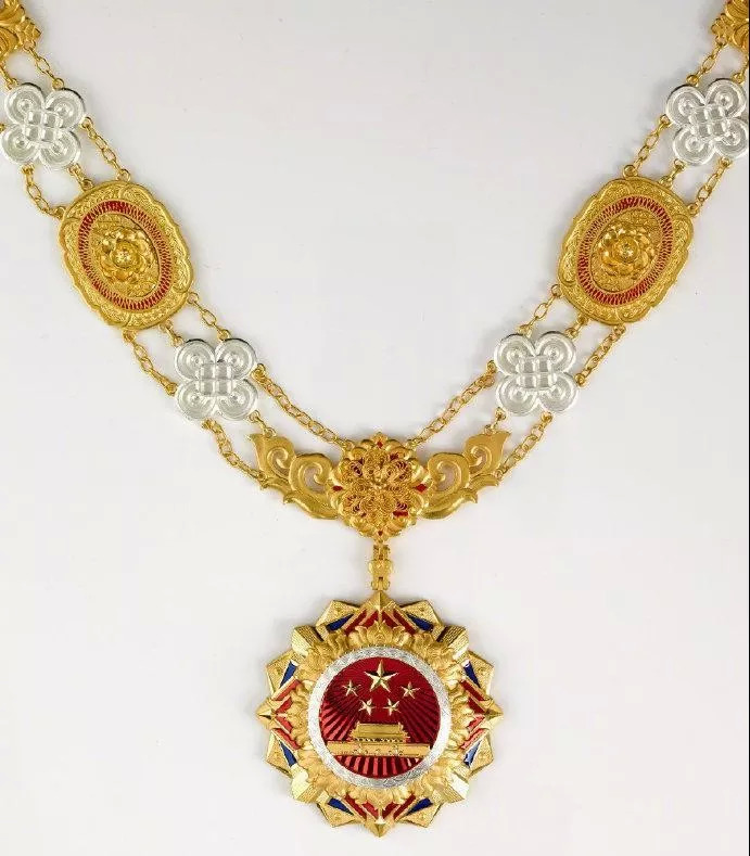 “友谊勋章”以金色、蓝色为主色调,章体采用和平鸽、地球、握手、荷花等元素,章链采用中国结、万年青、牡丹、玉璧、兰草等元素,整体使用花丝镶嵌、掐丝珐琅等传统工艺手工制作,象征中国人民同各国人民友好团结、友谊长存,祝愿世界各国共同繁荣发展。