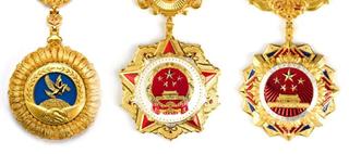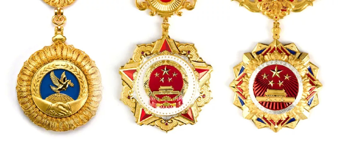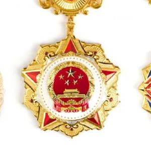 国家荣誉称号奖章以红色、金色为主色调,章体采用五星、天安门、牡丹、旗帜、光芒等元素,章链采用中国结、花卉等元素,整体使用冷压成型、花丝镶嵌、珐琅等工艺制作,象征国家荣誉称号获得者在各领域各行业作出的重大贡献,彰显示范引领作用,激励全国各族人民不忘初心、牢记使命,为实现中华民族伟大复兴的中国梦而不懈奋斗。