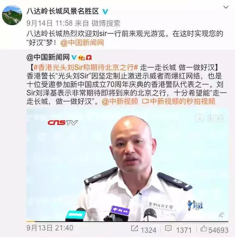 当天刘Sir刚从医院复诊回来。在7月30日处突过程中,他的膝盖和右眼受伤,但现在看起来已无大碍。刘泽基介绍说,明天(29日)他将和7名受伤警员和3名警官一同飞赴北京观礼,这是中央给香港警队的特殊礼遇。说到北京之行,他有两个最期待的事:一个是观看大阅兵,一个就是游长城,另外他还想尝一尝著名的北京烤鸭。他说大阅兵将展示新中国70年的国防成就,飞机、坦克、导弹,他都想看。至于登长城,他说这是他自小的梦想。小时候就知道“从太空能看长城,就觉得很神奇,长大了一定要去看一看。他笑言表露这个愿望后,很多很多网友劝他千万不要去,因为国庆节长城人太多了。就在刘泽基打退堂鼓的时候,长城管理部门联系到他,告诉他将为他开辟“绿色通道”,帮助他实现梦想。所以可以肯定的是,刘Sir的“好汉”本色将在长城得到“确认”。