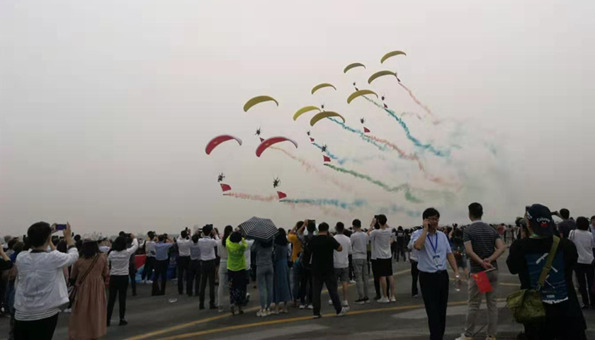 开幕仪式上,中国金翼动力伞、欧洲环球之星、极限天空、拉脱维亚波罗的海蜜蜂、意大利蓝环和开拓者、英国空中焰火等表演队分别进行了动力伞带国旗彩烟、单机喷气式特技飞行、多机编队带彩烟礼花弹特技飞行等表演。