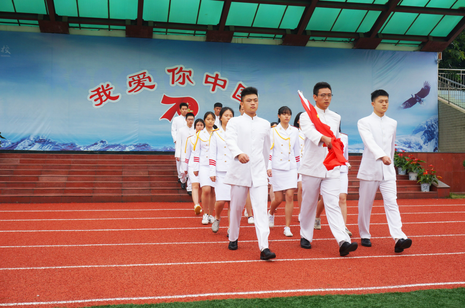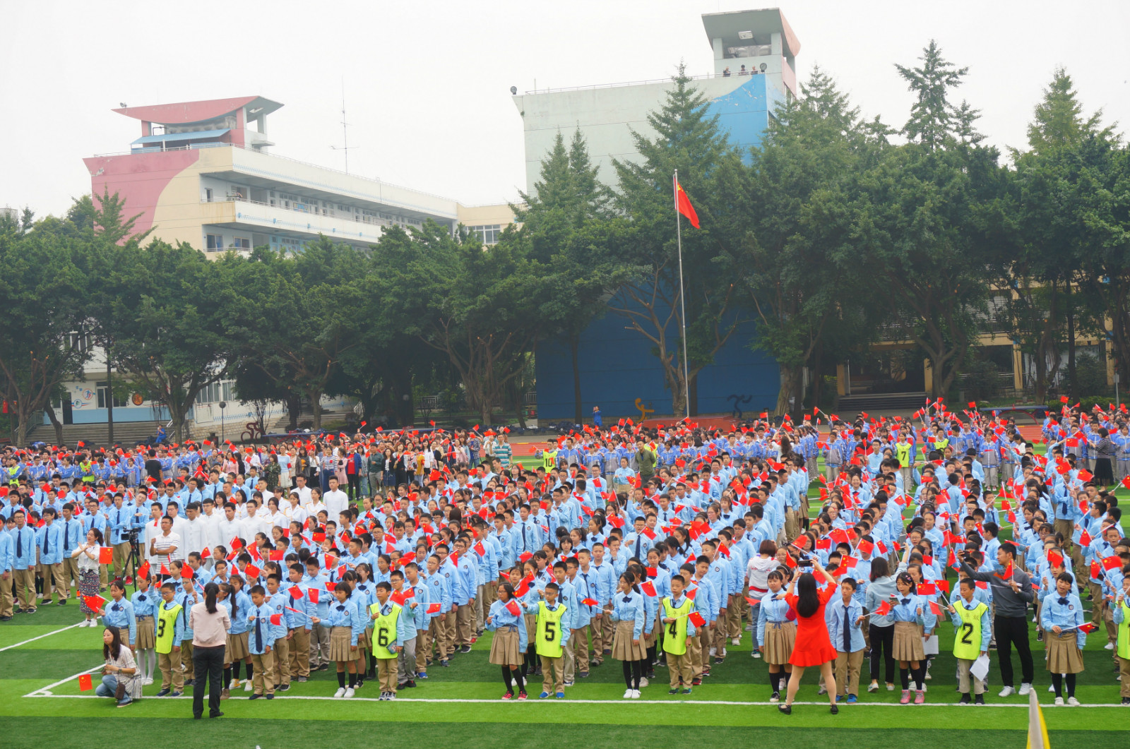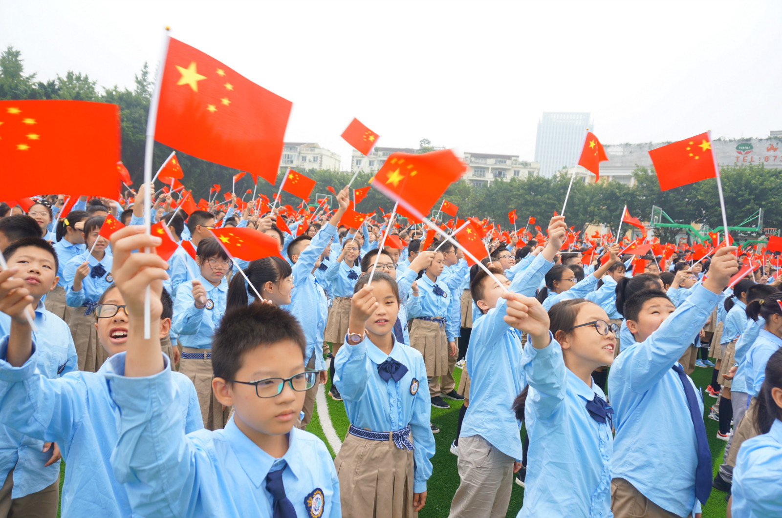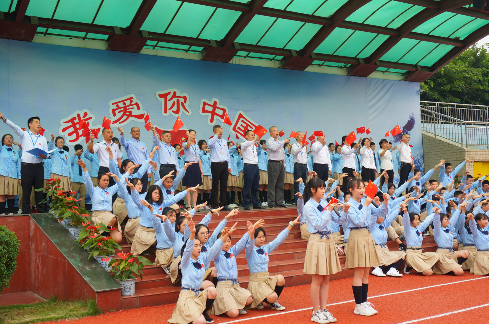 全校师生高举手中的红旗,大声呐喊:我爱你,中国!数千人大合唱《歌唱祖国》,熟悉的旋律满溢对祖国的祝福!