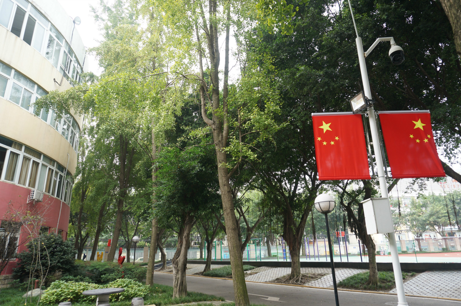 升旗台前高高飘扬着五星红旗,林荫道两旁整整齐齐悬挂着五星红旗,办公室每一位老师桌前斜插着五星红旗,走廊文化墙上描绘着五星红旗。一面面鲜艳的国旗,一颗颗热烈的丹心,昭示着师大实外人对祖国满腔的热爱。