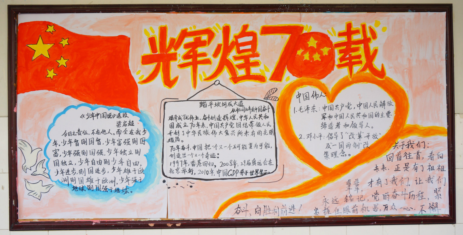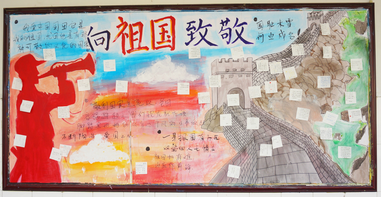 电子屏上滚动的祝语,班级黑板报上滚烫的文字,主题班会上孩子们热烈的发言,无一不诉说着对祖国母亲的深情。