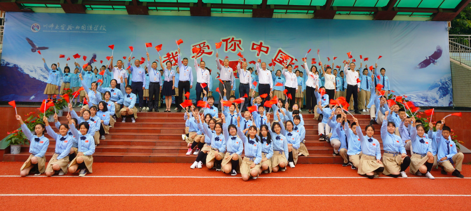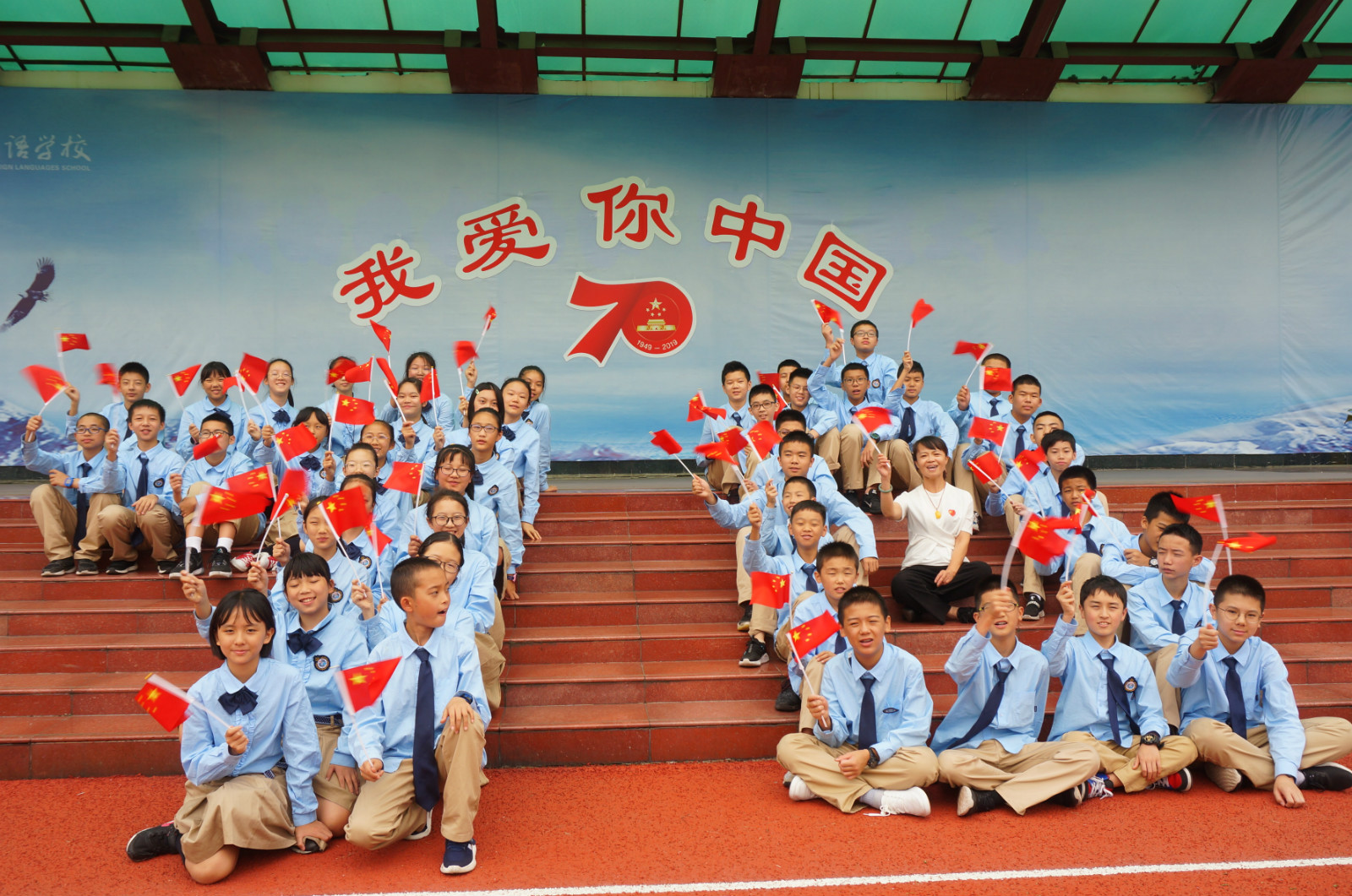 为迎接祖国母亲七十华诞,四川师范大学实验外国语学校采用多种形式营造节日庆典氛围,展现师生拳拳爱国之心。