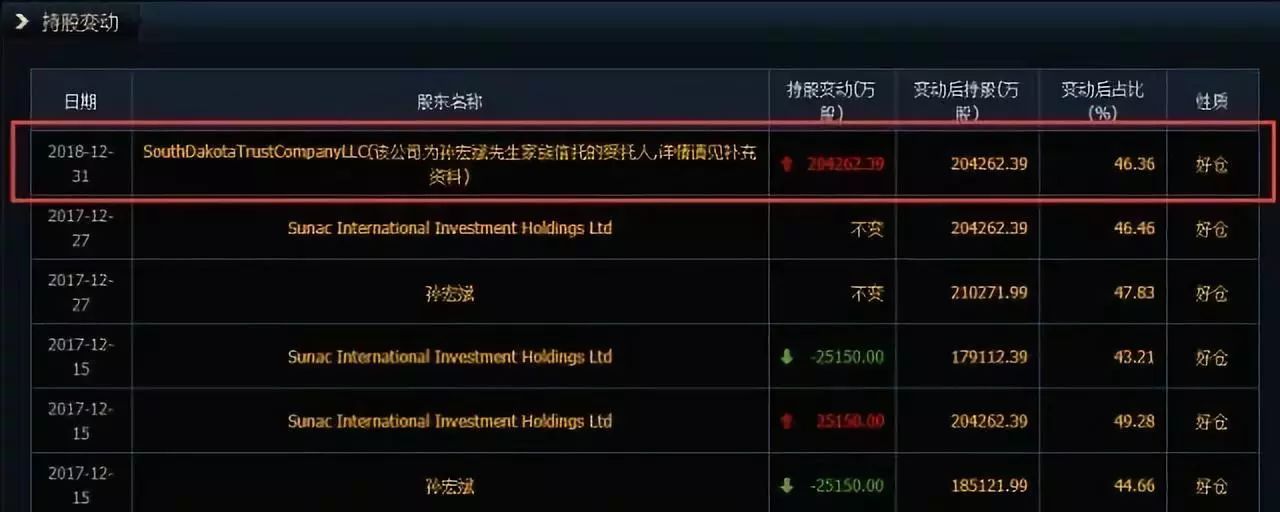 (图:2018年底,持股人South Dakota Trust Co.持有20亿股股票,可知两个/多个孙氏家族信托受托人相同,孙氏家族信托全设在了美国南科他州。)