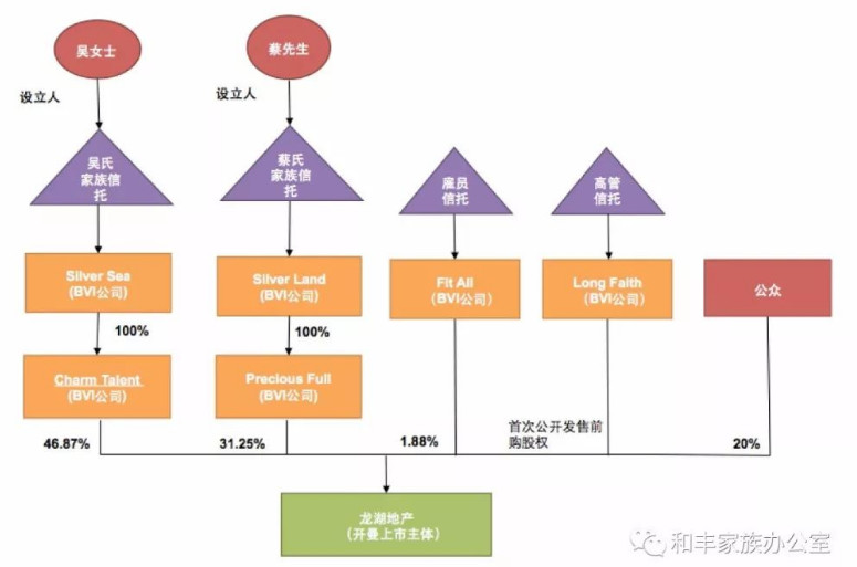 龙湖地产吴亚军更是用家族信托的老手。上市前,她就和当时的老公蔡奎分别设了家族信托(吴氏和蔡氏家族信托),俩人分别用家族信托搭上BVI公司,持有龙湖地产股份。