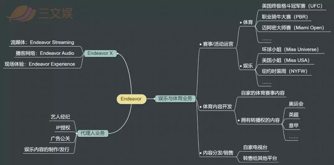 2016年,他们收购了美国终极格斗冠军赛(UFC)的母公司 Zuffa。2018年,Endeavor又收购流媒体技术公司NeuLion,随后成立Endeavor Streaming品牌,为NFL、NBA、WWE 等体育赛事提供流媒体解决方案。